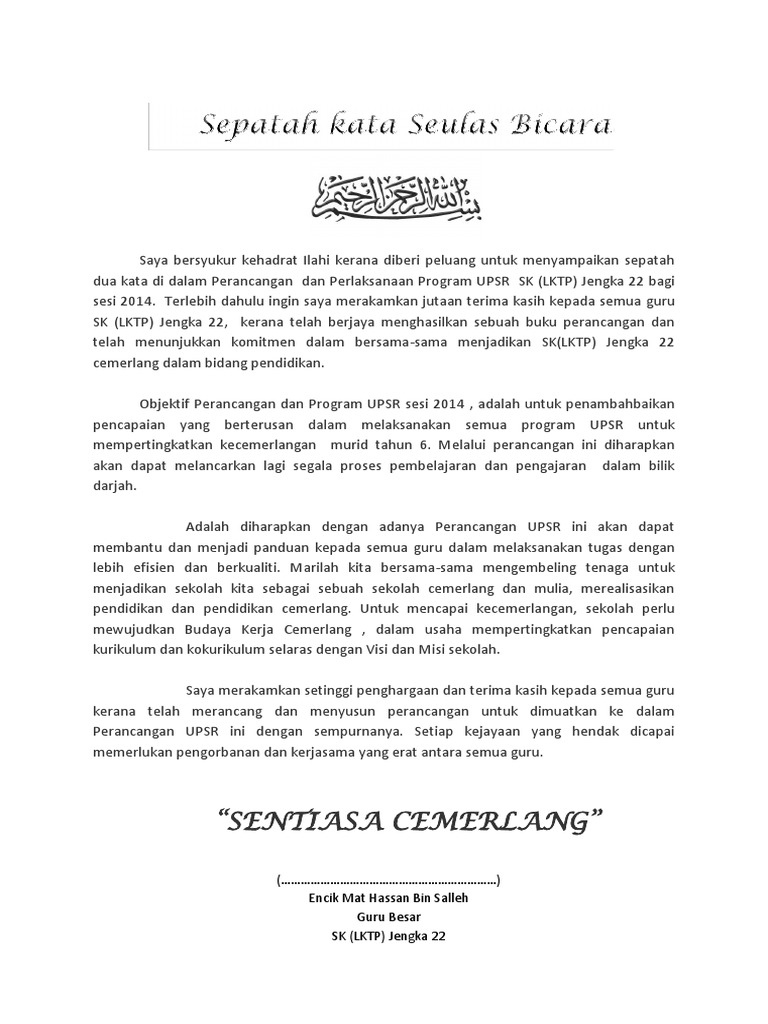 AJK Data dan 1. PENGENALAN Program Motivasi Kecemerlangan UPSR Siri 1 2017 ini dilaksanakan sebagai persediaan awal murid-murid Tahun 6 SK Pos Raya bagi menghadapi Ujian Pencapaian Sekolah Rendah 2017. View flipping ebook version of BUKU PROGRAM Kecemerlang pra-upsr tahun 5 2020 published by syafarina saman on 2020-01-09.
